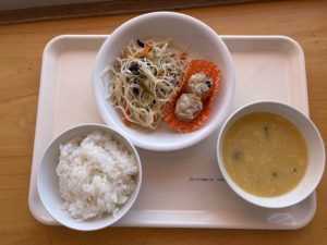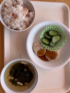 こぎつねうどん、かつおきゅうり、りんごヨーグルト和え